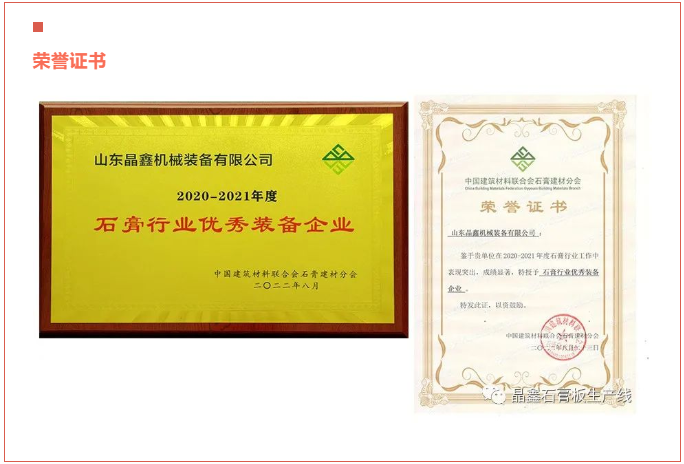 整個(gè)會(huì)議充滿(mǎn)著熱情洋溢的氣氛,頒獎(jiǎng)環(huán)節(jié),山東晶鑫機(jī)械裝備有限公司憑借行業(yè)深耕10多年積累的創(chuàng)新技術(shù),依托科技環(huán)保、質(zhì)量可靠、配套設(shè)施完善,榮獲“2020-2021年度石膏行業(yè)優(yōu)秀裝備企業(yè)”獎(jiǎng)項(xiàng)。