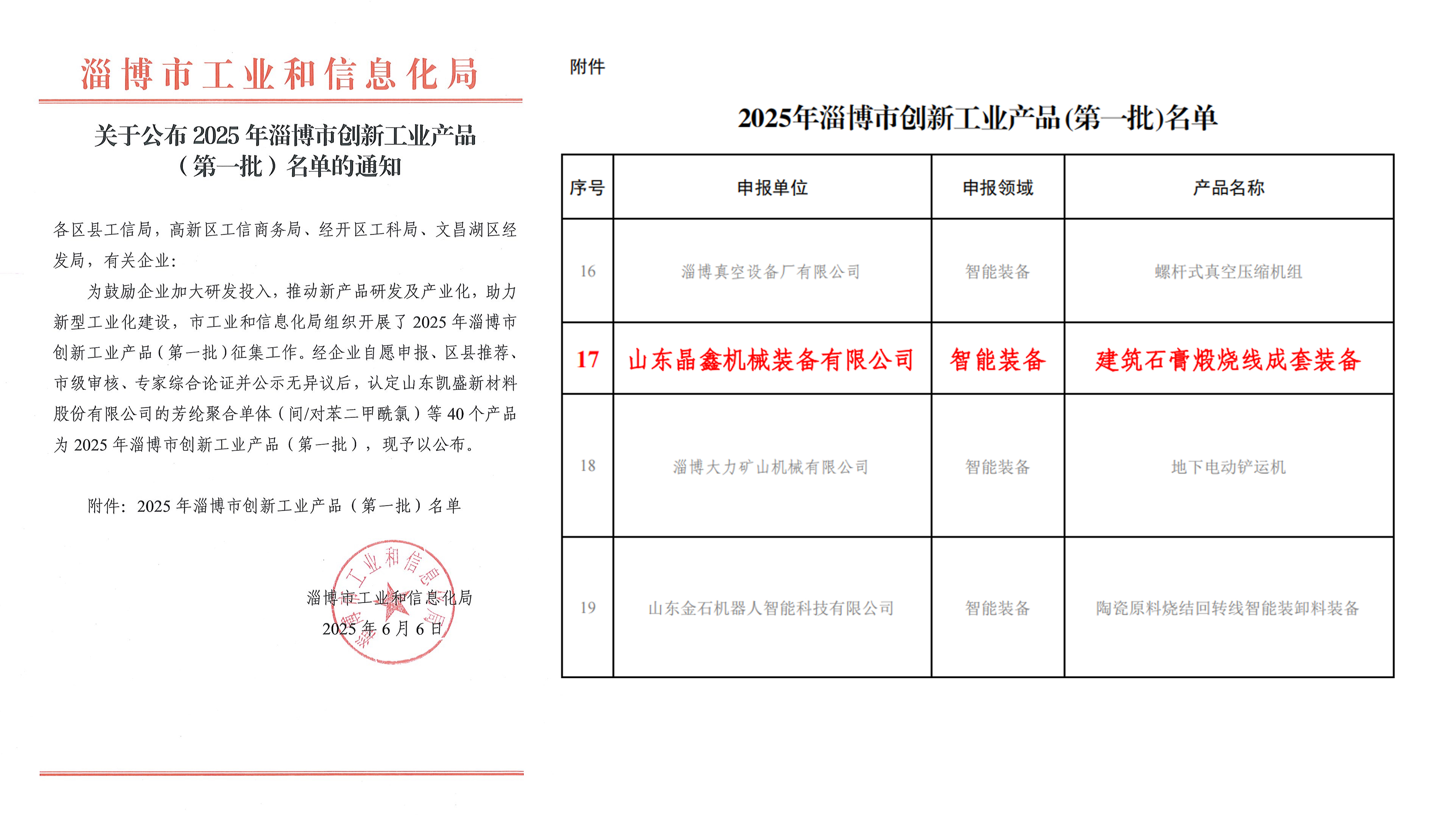 - 晶鑫公司建筑石膏煅燒線成套裝備被認(rèn)定為2025年淄博市創(chuàng)新工業(yè)產(chǎn)品(第一批) 2025-06-11