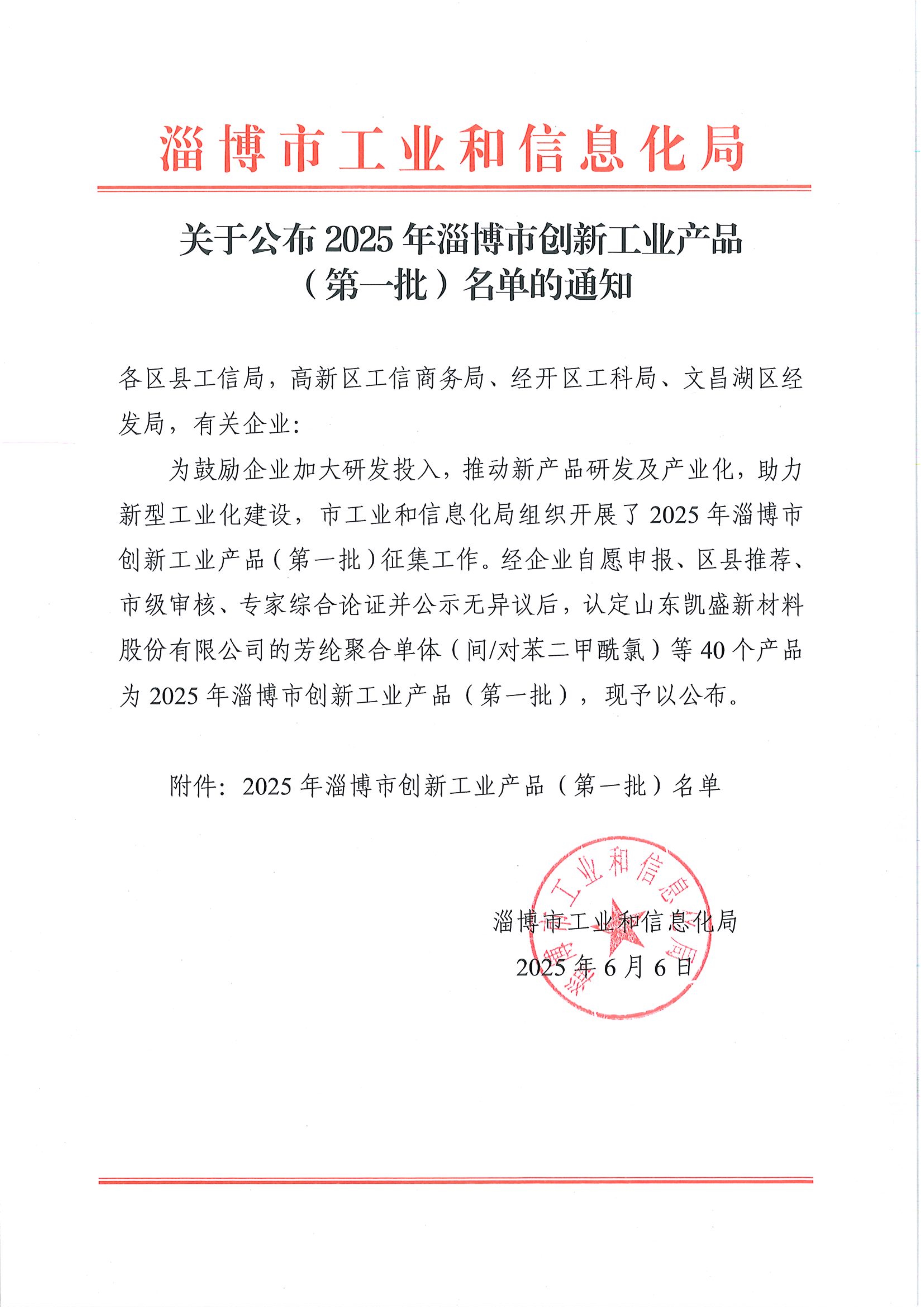 經(jīng)企業(yè)自愿申報、區(qū)縣推薦市級審核、專家綜合論證并公示無異議后,認(rèn)定山東凱盛新材料股份有限公司的芳綸聚合單體(間/對苯二甲酰氯)等40個產(chǎn)品為2025年淄博市創(chuàng)新工業(yè)產(chǎn)品(第一批),現(xiàn)予以公布